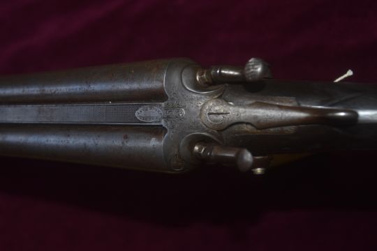 A 12 bore side-by-side hammer shotgun by A. Davidson, serial no. 7391, with approximately 30 inch barrels, external hammers, double triggers, engraved action, and figured walnut stock. An honest period sporting gun with visible wear and patina consistent with age. UK Firearms Act Statement: This lot is classified as a Section 2 shotgun under the UK Firearms Act 1968. Purchase requires a valid Shotgun Certificate. All transfers must be conducted through a Registered Firearms Dealer (RFD).