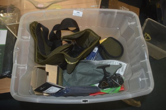 Box of Assorted Fishing Reel, Reel Bags, Velvet Rod Bag, etc.