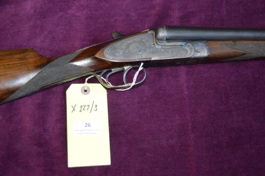 A Spanish 12 gauge side-by-side sidelock shotgun with 27.5 inch barrels, double triggers, and engraved action. Fitted with chequered wooden stock and fore-end. Serial number 94585. Showing typical wear consistent with use. Please note: This lot is a Section 2 shotgun under the Firearms Act 1968. A valid Shotgun Certificate is required to purchase. All transfers must be completed in accordance with current UK firearms legislation.