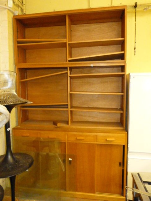 Light Oak Storage Unit Enclosed by Sliding Plate Glass Doors