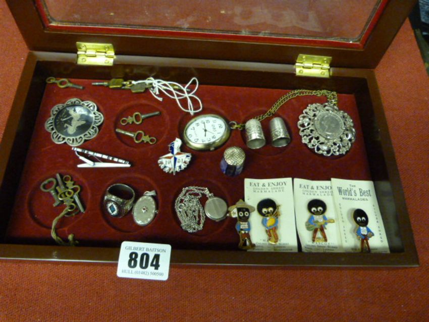 Small Jewellery Box Containing Silver Thimbles - Necklaces - Golliwog Badges etc