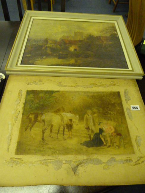 Framed Oil Canvas Painting Depicting a Church Scene & 3 Other Framed Prints