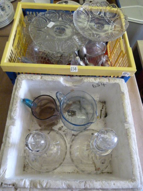 2 Boxes of Glassware Including Decanters - Cake Stands etc