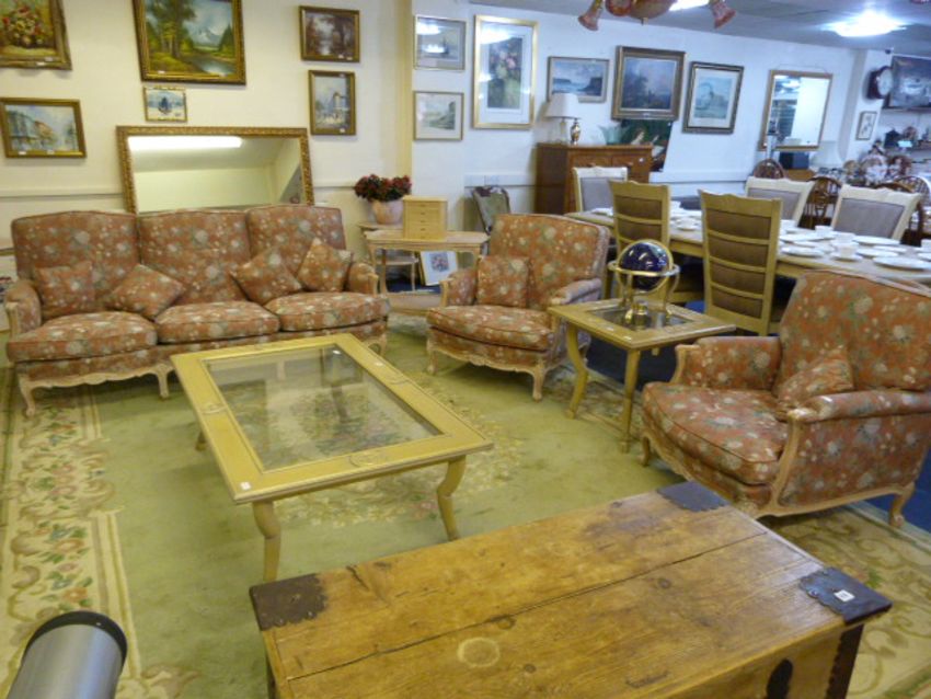 3 Piece Suite in Red & Floral Upholstery with Scatter Cushions in Shabby Chic Finish