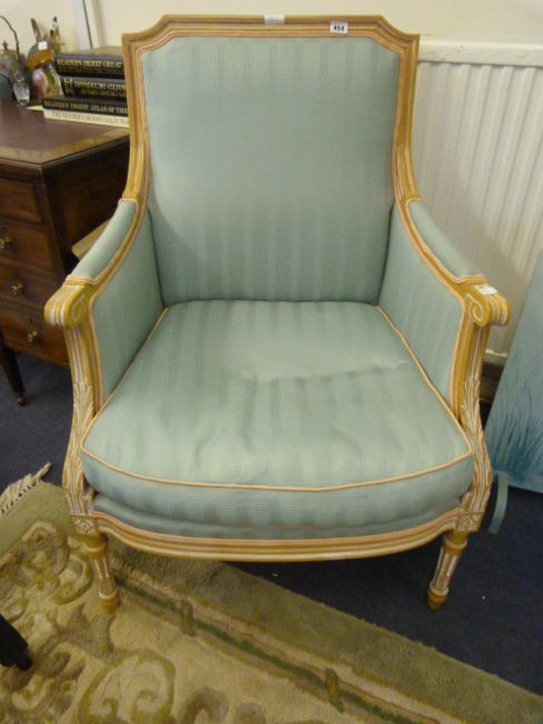 Duck Egg Blue Upholstered Armchair with Shabby Chic Carved Light Wood Frame