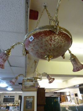 Pair of Red & White Glass Brass 3 Branch Chandeliers