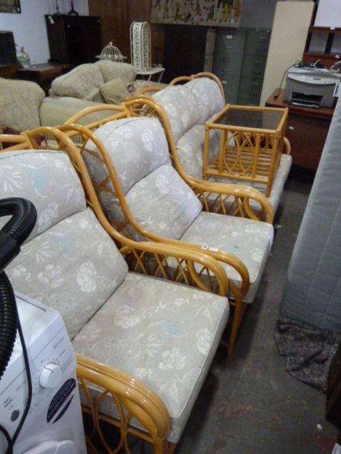 Bamboo Settee & 2 Chairs with Cushions & Glass Topped Coffee Table
