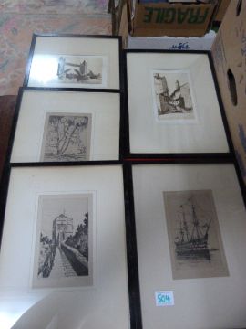 6 Framed Original Etchings Depicting Various Scenes