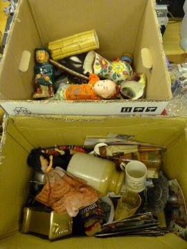 2 Boxes of Bric-a-Brac including Toby Jugs - Commemorative Ware - Postcards etc