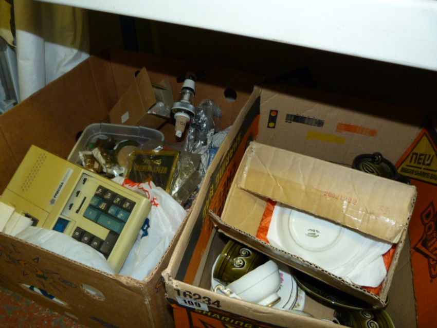 2 Boxes Containing China - Bric-a-Brac - Onyx Lighter - Chess Pieces - Adding Machine etc