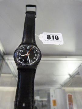 *Swatch Unisex Red Sunday Black Dial & Leather Strap Watch