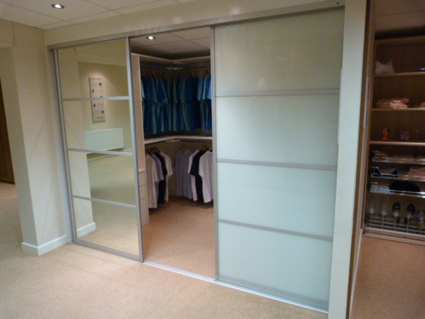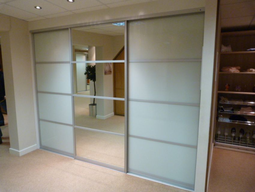 *Walk in Dressing Room enclosed by Triple Sliding Doors in Soft White & Silver Finish Mirror with Brushed Aluminium Trim