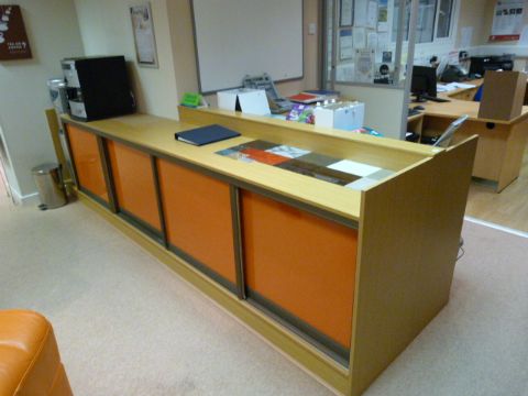 *Large Serve Over / Reception Counter in Light Oak Finish enclosed by Sliding Doors