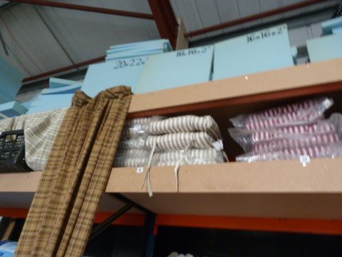 Lots Include, 300 Full and Part Rolls of Fabric, Curtain Lining, Net Curtains, Curtain Poles, Large Stock of Scatter Cushions, Cutting Tables, Fabric Racks and Display Stands, 5 Bays of Pallet Racking and 12 Bays of Medium Duty Shelving, Light Oak Reception Desk and Office Furniture, Desk Top PCs, Chairs and Filing Units, Stock of Current Fabric Samples, Warehouse Steps, Industrial Barrows, Etc….