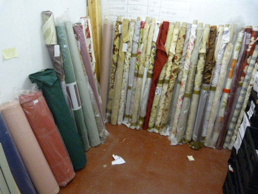 Lots Include, 300 Full and Part Rolls of Fabric, Curtain Lining, Net Curtains, Curtain Poles, Large Stock of Scatter Cushions, Cutting Tables, Fabric Racks and Display Stands, 5 Bays of Pallet Racking and 12 Bays of Medium Duty Shelving, Light Oak Reception Desk and Office Furniture, Desk Top PCs, Chairs and Filing Units, Stock of Current Fabric Samples, Warehouse Steps, Industrial Barrows, Etc….