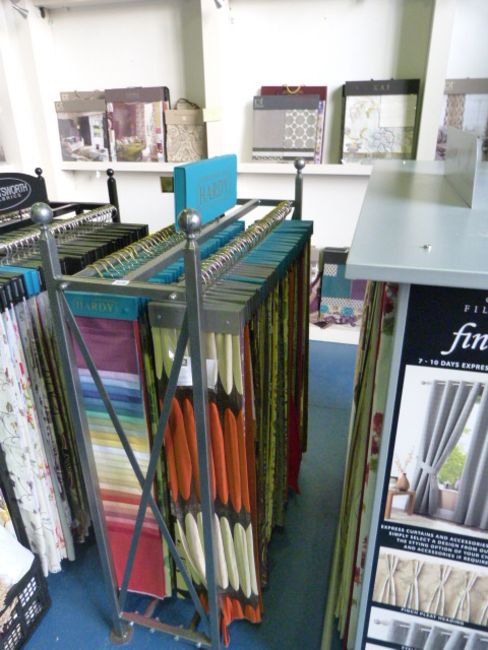 Lots Include, 300 Full and Part Rolls of Fabric, Curtain Lining, Net Curtains, Curtain Poles, Large Stock of Scatter Cushions, Cutting Tables, Fabric Racks and Display Stands, 5 Bays of Pallet Racking and 12 Bays of Medium Duty Shelving, Light Oak Reception Desk and Office Furniture, Desk Top PCs, Chairs and Filing Units, Stock of Current Fabric Samples, Warehouse Steps, Industrial Barrows, Etc….