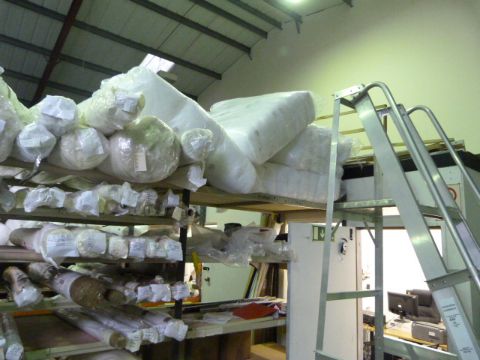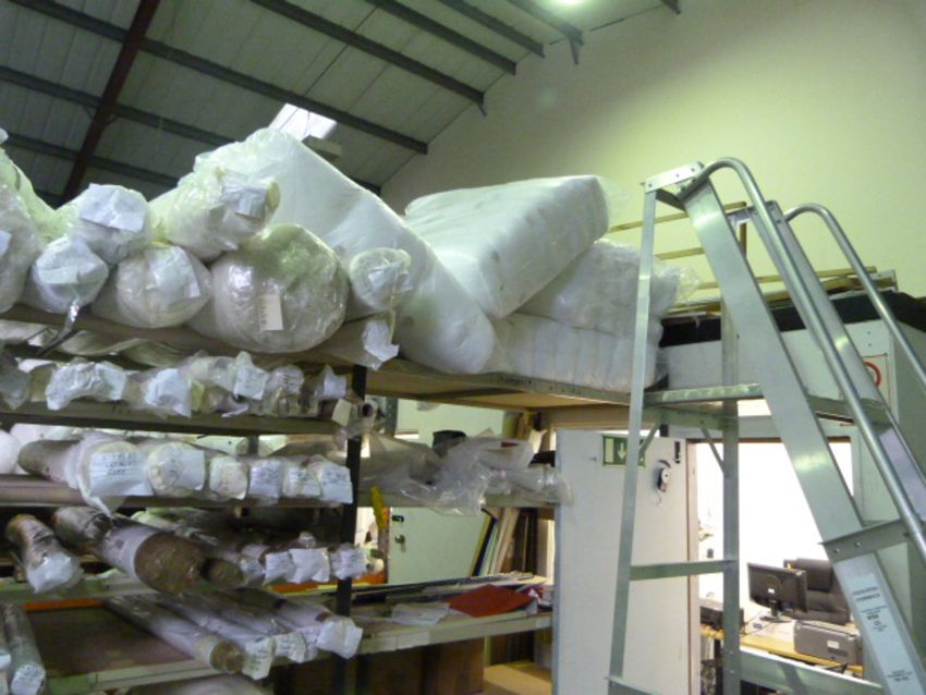 Lots Include, 300 Full and Part Rolls of Fabric, Curtain Lining, Net Curtains, Curtain Poles, Large Stock of Scatter Cushions, Cutting Tables, Fabric Racks and Display Stands, 5 Bays of Pallet Racking and 12 Bays of Medium Duty Shelving, Light Oak Reception Desk and Office Furniture, Desk Top PCs, Chairs and Filing Units, Stock of Current Fabric Samples, Warehouse Steps, Industrial Barrows, Etc….
