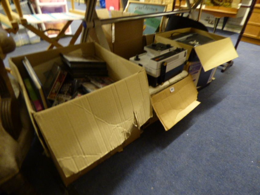 3 boxes of bric-a-brac including DVDs, projector and shredder etc.