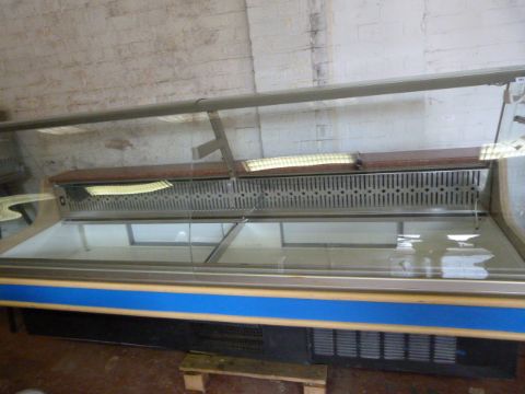 Deli Style Refrigerated Serve Over Counter with Simulated Granite Back and Curved Glass Front by Sifa Model Number AOBDBB250