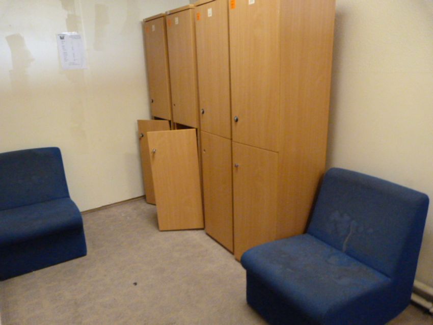 7 Light Beech Double Lockers & 2 Blue Reception Chairs