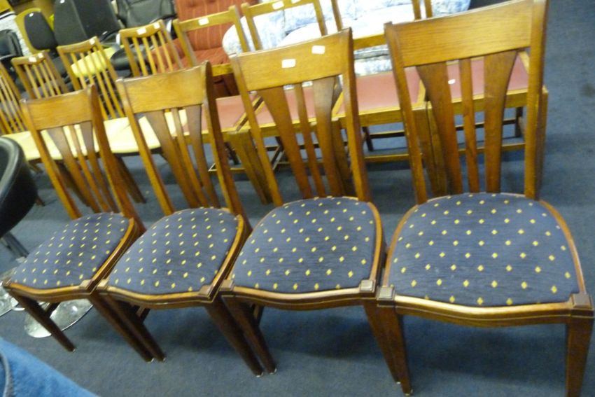 4 Medium Oak Dining Chairs with Slat Backs & Upholstered Seats