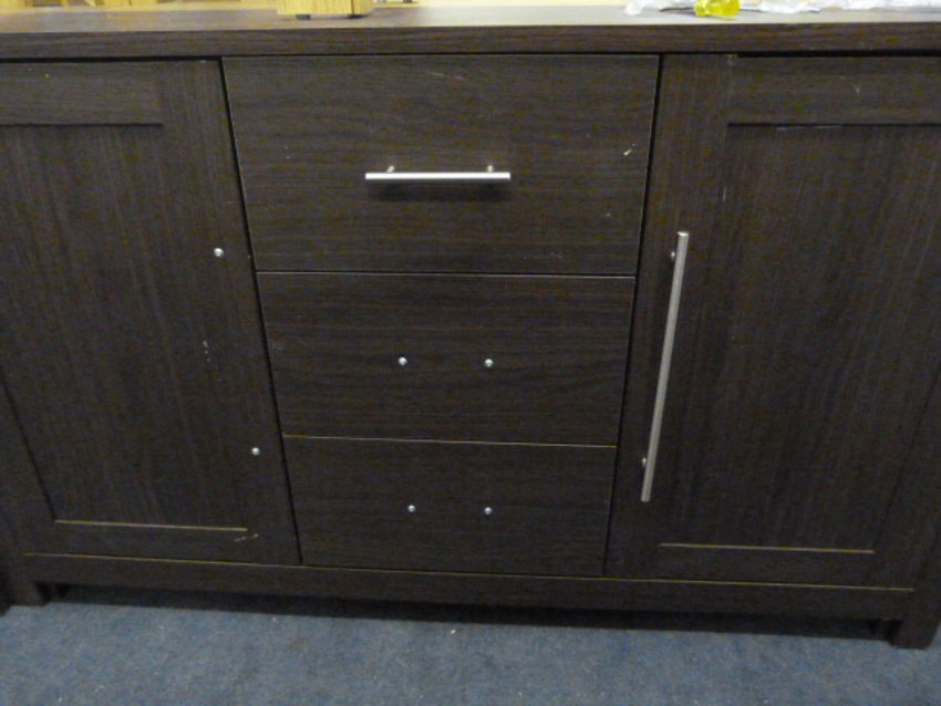 *Sideboard Unit enclosed by Double Doors with 3 Drawers in Dark Wood Finish and Brushed Stainless Steel Handles