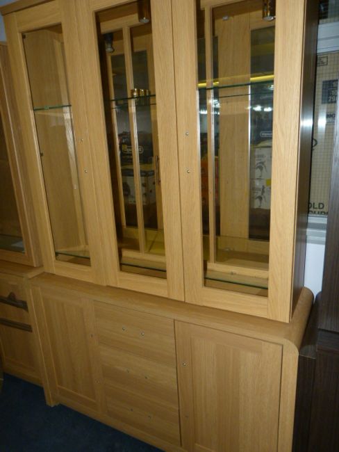 *Mirror Backed Display Unit over Sideboard in Light Oak Finish with Brushed Stainless Steel Handles