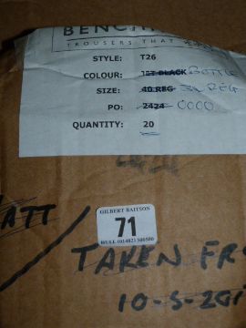 *Box containing 20 Pairs of Bench Mark T26 Bottle Green Size 34 Regular Working Trousers