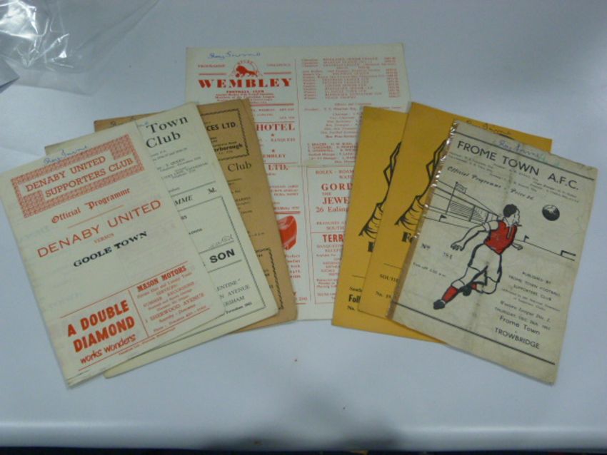 7 Non League Programs Including Frome Town, 1957, Dewaby United 1957 , Faversham Town 1957, Folkstone 1957, Kings Lynn 1958 and Wembley F.C 1959