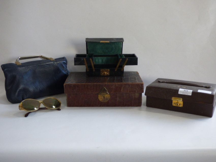 3 Trinket boxes & blue handbag