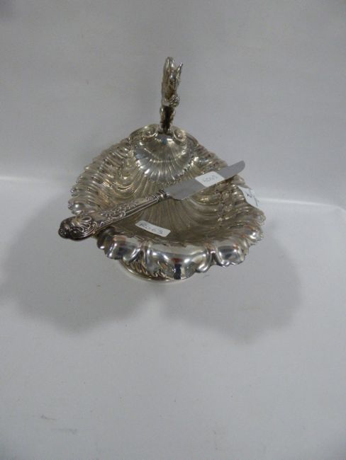 Silver plated nut dish with silver handled cake knife