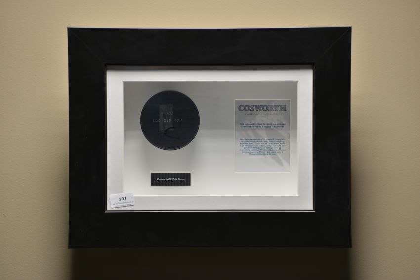 GENUINE COSWORTH CA2010 PISTON FROM A FORMULA 1 ENGINE COMPONENT LOTUS VIRGIN OR HRT WITH CERTIFICATE OF AUTHENTICITY BEAUTIFULLY FRAMED