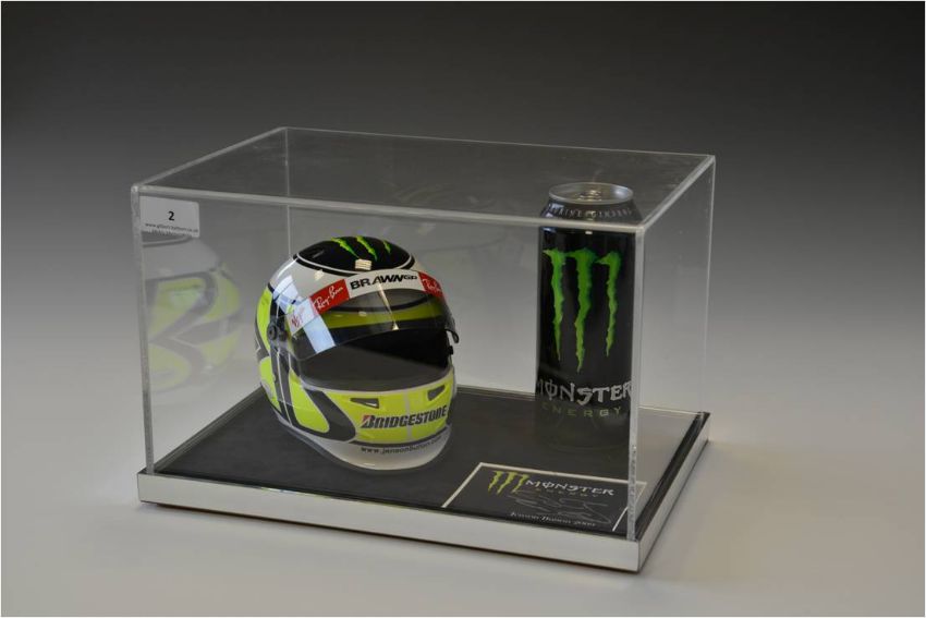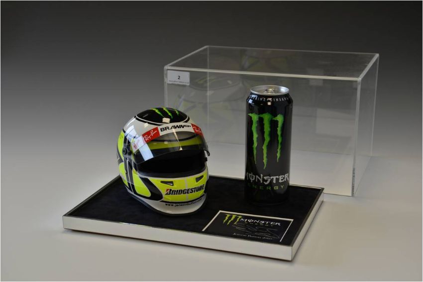 Half size replica of Jenson Button, Brawn Helmet. Monster Energy presentation Acrylic display with Jenson Button autograph.