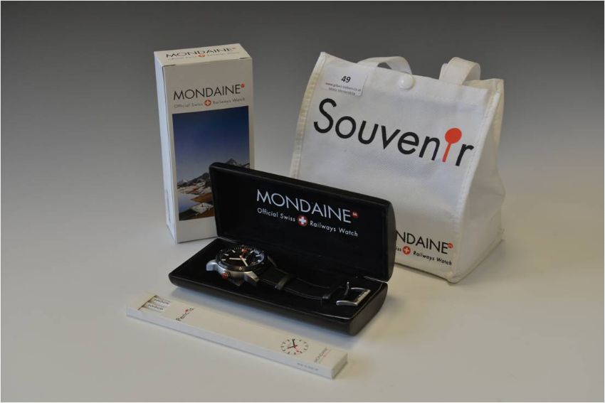 OFFICIAL SWISS WATCH MONDAINE COMES IN ORIGINAL BOX AND MINI TOTE BAG WITH PENCILS UNUSED UNWORN BRAND NEW EXCELLENT CONDITION - SAPHIRE CRYSTAL FACE WITH DATE, GENUINE LEATHER STRAP MODEL NUMBER- CBB CFF FFS