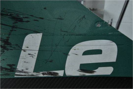 THIS BARGE BARRIER TRIM SIGNED BY DAVID BRABHMAN WITH SPONSORSHIP AND BRANDING THIS IS THE ACTUAL BARGE BARRIER TRIM FROM THE ASTON MARTIN DBR009 RACE CAR RACED IN 2008 LE MANS 24OUR DRIVEN BY DAVID BRABHMAN - FULL SIZE