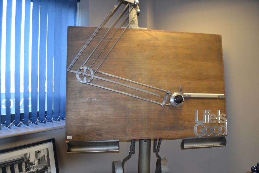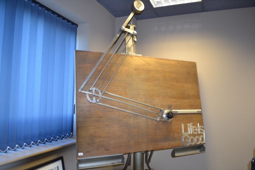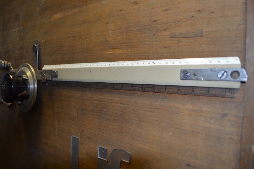 drawing board with bakerlight isis ruler, everything fully working, with all tilt mechanism, original pressed wooden board,tripod legs, just under 3Metres hight, this is stunning and original working architect board.