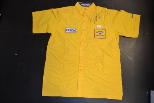 In Lotus yellow, original Lotus Team Engineers signed embroidered shirt.