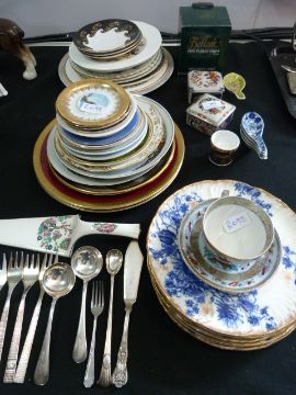 assorted decorative plates, trinket boxes, oriental spoons, silver plated cutlery, etc