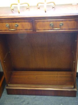 Reproduction figured mahogany open fronted bookcase with draws