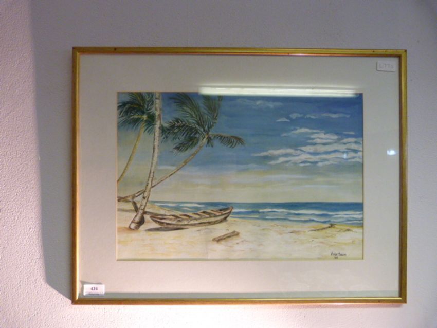 Gilt framed water color by Vivian Hakim of a tropical scene