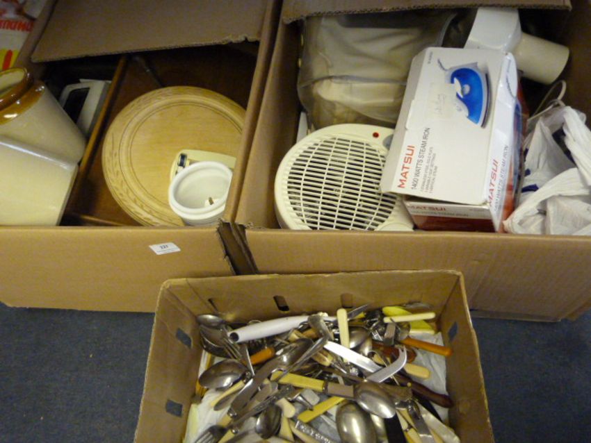Two Boxes of Assorted Kitchenalia, Stone Jars, Silver Plated Cutlery, Etc