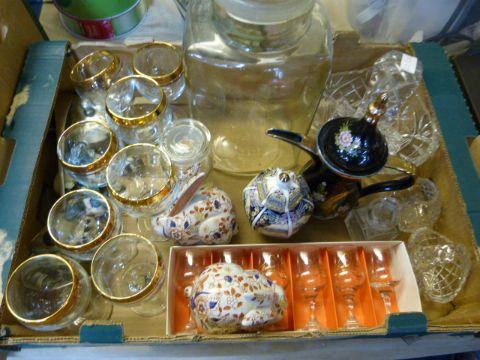 Box Containing Assorted Bohemian Glass, Imari Style Rabbits, Glassware, Etc