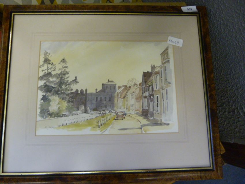 Simulated Walnut Framed Watercolour of the "North Bar Without Beverley" By K. Glen