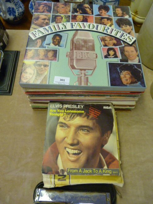 Collection of LPs, 45s and a Hohner Harmonica