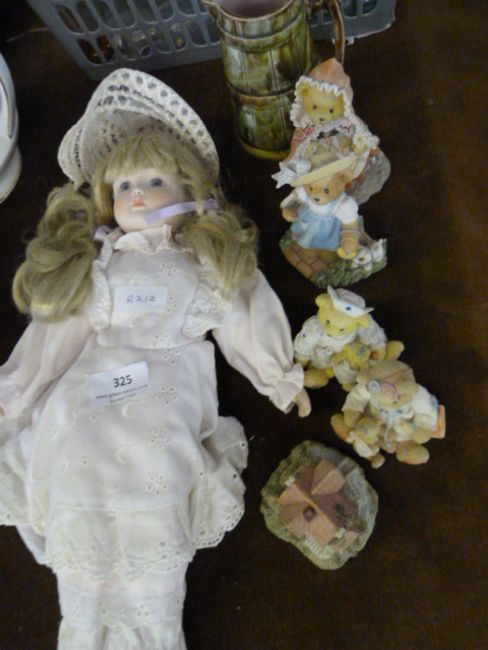 Porcelain Headed Doll, Decorative Teddy Bears and a Miniature Cottage