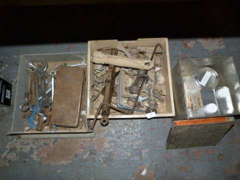 Three Boxes Containing Assorted Spanners, Sash Cord, Shelf Brackets, Etc