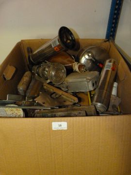 Mixed Box Containing Assorted Hurricane Lamps, Whistling Kettles, Blow Lamps, Hand Tools, Etc