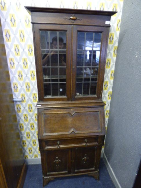 Small Oak Bureau Bookcase with Glazed Doors