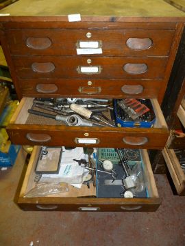 Nine Drawer Wood Chest Containing Tapson Dyes, Threaded Bar, Engineer's Tools, Micrometres, Etc