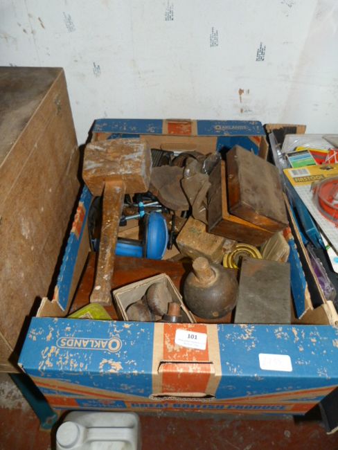 Box Containing Ear Defenders, Mallets, Vintage Furniture Knobs, Etc
